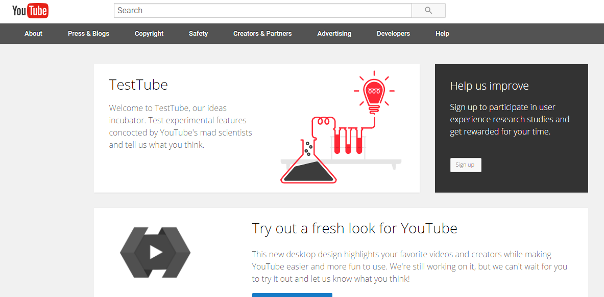 انتقل إلى youtube.com/testtube وحدد تجربة وظيفة مشغل يوتوب المعاد تصميمها. ستتمكن من اختبار الميزات التجريبية.